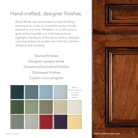 wood-mode.com Hand-crafted, designer finishes.Wood-Mode uses time-tested furniture finishing techniques to create an incredible variety of looks tailored to any home. Whether it is a solid color or grain-enhancing stain, our multi-step process highlights the beauty of the wood, while a catalyzedoven-baked topcoat protects the finish for a lifetime of beauty and durability.13Stained finishesDesigner opaque seriesGlazed and burnished finishesDistressed finishesCustom color programRefer to wood-mode.comto view the complete palette.Westbury Raised door style