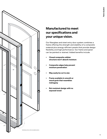 13Frame SystemManufactured to meet our specifications and your unique vision.Our fiberglass and steel entry door system combines a frame offering the strength and stability of a composite material plus energy-efficient panels that provide design flexibility and high performance. Our frame and panel can be painted or stained. Added benefits include:• Closed composite cellular structure won’t absorb moisture• Composite edges help prevent moisture penetration• May easily be cut to size• Frame available in smooth or wood-grain that resembles mahogany• Rot-resistant design with no exposed woodRendering shown with all available options.
