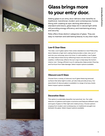 15Choosing the Right MaterialGlass brings moreto your entry door.Adding glass to an entry door delivers clear benefits to traditional, transitional, modern and contemporary homes. Along with creating an eye-catching alternative to standard solid doors, glass helps let in natural light while still providing energy efficiency and maintaining privacy and security. Pella offers three distinct categories of glass. They are easy to maintain and add lasting beauty to any door style. Low-E Clear GlassThe clear, Low-E glass option that comes standard on most Pella entry doors features a high-tech coating that provides a clear view out of and into your entryway, plus a lot more. In cold weather, Low-E glass can help reduce heat loss by reflecting it back into the home. In warm weather, it effectively reflects the sun’s rays to help keep the home’s interior cool. Energy-efficient Low-E coating also helps protect flooring and furniture from fade damage. Select impact options available.Obscure Low-E GlassChoose from a variety of obscure Low-E glass featuring textured surfaces that allow light to enter, yet also help provide privacy. Our assortment of obscure glass is available in a range of privacy levels. Select impact options available.Decorative GlassThis option is undeniably beautiful, but practical, too. Our wide selection of patterns and styles is exclusive and features different sizes and types of glass to filter light and create privacy. Choose options ranging from modern and contemporary to traditional wrought-iron between the glass. Select impact options available.