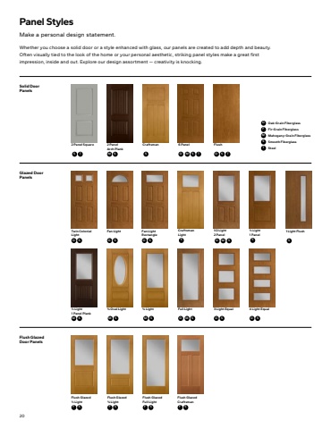 20 Full LightO M S3/4 LightM SPanel StylesWhether you choose a solid door or a style enhanced with glass, our panels are created to add depth and beauty. Often visually tied to the look of the home or your personal aesthetic, striking panel styles make a great first impression, inside and out. Explore our design assortment — creativity is knocking.Make a personal design statement.Solid DoorPanels2 Panel SquareS TFlush Glazed Full LightF SFlush Glazed CraftsmanF S1 Light FlushSFlush Glazed 3/4 LightF SFlush Glazed 1/2 LightF S4 Light EqualO S3 Light EqualO S 1/2 Light 1 PanelS1/2 Light 2 Panel Glazed DoorPanelsFlush GlazedDoor PanelsFan Light O SFan Light RectangleO STwin Colonial Light O S3/4 Oval LightM SCraftsman LightS1/2 Light 1 Panel PlankM S FlushO S T6 PanelO M S T2 Panel Arch PlankM SCraftsmanSO Oak-Grain FiberglassF Fir-Grain FiberglassM Mahogany-Grain FiberglassS Smooth FiberglassT SteelO M S