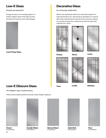 26 Low-E Glass Decorative GlassWhat’s the real beauty behind our decorative glass? It is high-performance art, welcoming an abundance of natural light while maintaining the perfect level of privacy. Explore our myriad of distinctive collections to find the style that matches your vision.An entryway statement.Tune Lovilia DanburyHuxley AvocaLow-E Obscure GlassLucasPella’s obscure glass patterns provide unique design simplicity.An elegant way to add privacy.Energy-saving Low-E insulating glass is a simple, elegant option that helps protect flooring and furniture from fade damage.Simple yet beautiful.Low-E Clear GlassChordPrivacy Rating: 9Double WaterPrivacy Rating: 9Satin EtchPrivacy Rating: 9PearPrivacy Rating: 9Narrow ReedPrivacy Rating: 7
