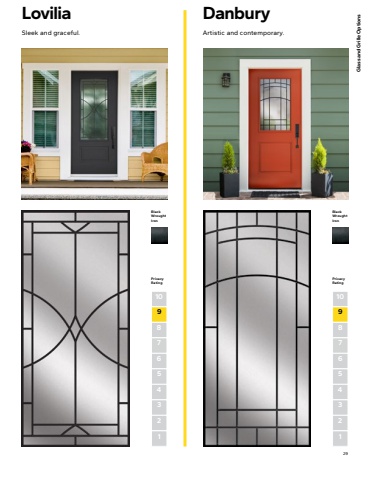29Glass and Grille OptionsDanburyArtistic and contemporary.Black Wrought IronPrivacyRating87654321910LoviliaSleek and graceful.Black Wrought IronPrivacyRating87654321910