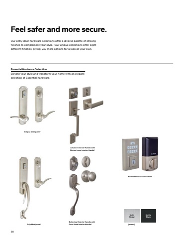 38 Eclipse Multipoint2Grip Multipoint2Amador Exterior Handle with Breton Lever Interior Handle2Belleview Exterior Handle with Cove Knob Interior Handle2Kwikset Electronic DeadboltEssential Hardware CollectionElevate your style and transform your home with an elegant selection of Essential hardware.Feel safer and more secure.Our entry door hardware selections offer a diverse palette of striking finishes to complement your style. Four unique collections offer eight different finishes, giving you more options for a look all your own.(shown)SatinNickelMatteBlack