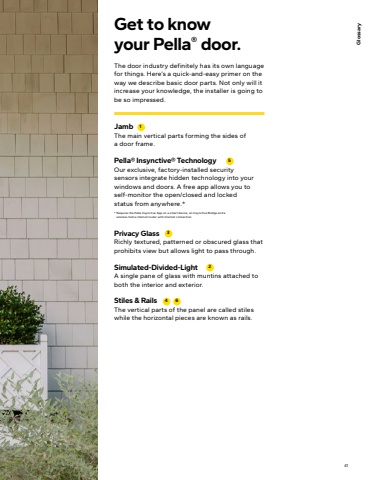 41GlossaryThe door industry definitely has its own language for things. Here’s a quick-and-easy primer on the way we describe basic door parts. Not only will it increase your knowledge, the installer is going to be so impressed.Jamb The main vertical parts forming the sides of a door frame.Pella® Insynctive® TechnologyOur exclusive, factory-installed security sensors integrate hidden technology into your windows and doors. A free app allows you to self-monitor the open/closed and locked status from anywhere.** Requires the Pella Insynctive App on a smart device, an Insynctive Bridge and a wireless home internet router with internet connection.Privacy GlassRichly textured, patterned or obscured glass that prohibits view but allows light to pass through.Simulated-Divided-Light A single pane of glass with muntins attached to both the interior and exterior. Stiles & RailsThe vertical parts of the panel are called stiles while the horizontal pieces are known as rails.Get to knowyour Pella® door. 5 3 2 4 6 1