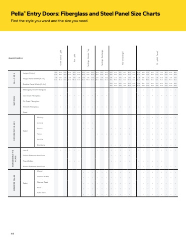 44 Pella® Entry Doors: Fiberglass and Steel Panel Size ChartsFind the style you want and the size you need.GLASS PANELS Twin Colonial Light Fan Light Fan Light Camber Top Fan Light Rectangle Craftsman Light*1/2 Light 2 Panel*CALL SIZESHeight (ft./in.) 6-ft. 8-in.6-ft. 8-in.6-ft. 8-in.6-ft. 8-in.6-ft. 8-in.6-ft. 8-in.6-ft. 8-in.6-ft. 8-in.6-ft. 8-in.6-ft. 8-in.6-ft. 8-in.6-ft. 8-in.6-ft. 8-in.6-ft. 8-in.6-ft. 8-in.8-ft. 0-in.8-ft. 0-in.8-ft. 0-in.6-ft. 8-in.6-ft. 8-in.6-ft. 8-in.6-ft. 8-in.7-ft. 0-in.7-ft. 0-in.8-ft. 0-in.8-ft. 0-in.8-ft. 0-in.Single-Panel Width (ft./in.) 2-ft. 8-in.2-ft. 10-in.3-ft. 0-in.2-ft. 8-in.2-ft. 10-in.3-ft. 0-in.2-ft. 8-in.2-ft. 10-in.3-ft. 0-in.2-ft. 8-in.2-ft. 10-in.3-ft. 0-in.2-ft. 8-in.2-ft. 10-in.3-ft. 0-in.2-ft. 8-in.2-ft. 10-in.3-ft. 0-in.2-ft. 6-in.2-ft. 8-in.2-ft. 10-in.3-ft. 0-in.2-ft. 8-in.3-ft. 0-in.2-ft. 8-in.2-ft. 10-in.3-ft. 0-in.Double-Panel Width (ft./in.) 5-ft. 4-in.5-ft. 8-in.6-ft. 0-in.5-ft. 4-in.5-ft. 8-in.6-ft. 0-in.5-ft. 0-in.5-ft. 4-in.5-ft. 8-in.6-ft. 0-in.5-ft. 4-in.6-ft. 0-in.5-ft. 4-in.5-ft. 8-in.6-ft. 0-in.MATERIALMahogany-Grain Fiberglass • • • • • •Oak-Grain Fiberglass • • • • • • • • • • • • • • • • • • • • •Fir-Grain FiberglassSmooth Fiberglass • • • • • • • • • • • • • • • • • • • • • • • • • • •SteelDECORATIVE GLASSSelectHuxley • • • • • • • •Avoca • • • • • • • • • • •Lucas • • • • • • • • • • • • • • • • •Tune • • • • • • • • • • • • • • • • •Lovilia • • • • • • • •Danbury • • • • • • • • • • • • • •NONDECORATIVE GLASS Low-E • • • • • • • • • • • • • • • • • • • • • • • •Grilles-Between-the-Glass • • • • • •Fixed Grilles • • • • • • • • • • • • • • •Blinds-Between-the-Glass • • • • • • • • •OBSCURE GLASSSelectChord • • • • • • • • • • • • • • • • • • • •Double Water • • • • • • • • • • • • • • • • • • • •Narrow Reed • • • • • • • • • • • • • • • • • • • •Pear • • • • • • • • • • • • • • • • • • • •Satin Etch • • • • • • • • • • • • • • • • • • • •