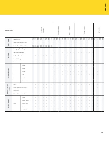 47GLASS PANELS Flush Glazed Full Light* 1/2 Light Sidelight* 3/4 Light Sidelight*Full Light Sidelight*Craftsman Light Sidelight*CALL SIZESHeight (ft./in.) 6-ft. 8-in.6-ft. 8-in.6-ft. 8-in.6-ft. 8-in.8-ft. 0-in.8-ft. 0-in.8-ft. 0-in.8-ft. 0-in.6-ft. 8-in.6-ft. 8-in.8-ft. 0-in.8-ft. 0-in.6-ft. 8-in.6-ft. 8-in.8-ft. 0-in.8-ft. 0-in.6-ft. 8-in.6-ft. 8-in.6-ft. 8-in.7-ft. 0-in.7-ft. 0-in.8-ft. 0-in.8-ft. 0-in.6-ft. 8-in.6-ft. 8-in.8-ft. 0-in.8-ft. 0-in.Single-Panel Width (ft./in.) 2-ft. 6-in.2-ft. 8-in.2-ft. 10-in.3-ft. 0-in.2-ft. 6-in.2-ft. 8-in.2-ft. 10-in.3-ft. 0-in.1-ft. 0-in.1-ft. 2-in.1-ft. 0-in.1-ft. 2-in.1-ft. 0-in.1-ft. 2-in.1-ft. 0-in.1-ft. 2-in.0-ft. 10-in.1-ft. 0-in.1-ft. 2-in.1-ft. 0-in.1-ft. 2-in.1-ft. 0-in.1-ft. 2-in.1-ft. 0-in.1-ft. 2-in.1-ft. 0-in.1-ft. 2-in.Double-Panel Width (ft./in.) 5-ft. 0-in.5-ft. 4-in.5-ft. 8-in.6-ft. 0-in.5-ft. 0-in.5-ft. 4-in.5-ft. 8-in.6-ft. 0-in.MATERIALMahogany-Grain Fiberglass • • • • • • • • • • • •Oak-Grain Fiberglass • • • • • • • • • • • • • •Fir-Grain Fiberglass • • • • • • • • • •Smooth Fiberglass • • • • • • • • • • • • • • • • • • • • • • •SteelDECORATIVE GLASSSelectHuxley • • • • • • • • • • • •Avoca • • • • • • • • • • • • • • •Lucas • • • • • • • • • • • • • • • •Tune • • • • • • • • • • • • • • • • • • •Lovilia • • • • • • • • • • • • • •Danbury • • • • • • • • • • • • • • • • • • •NONDECORATIVE GLASS Low-E • • • • • • • • • • • • • • • • • • • • • • • • • • •Grilles-Between-the-Glass • • • • • • • • • • • •Fixed Grilles • • • • • • •Blinds-Between-the-Glass • • • • • • • •OBSCURE GLASSSelectChord • • • • • • • • • • • • • • • • • • • • • • • • • • •Double Water • • • • • • • • • • • • • • • • • • • • • • • • • • •Narrow Reed • • • • • • • • • • • • • • • • • • • • • • • • • • •Pear • • • • • • • • • • • • • • • • • • • • • • • • • • •Satin Etch • • • • • • • • • • • • • • • • • • • • • • • • • • •Size Charts