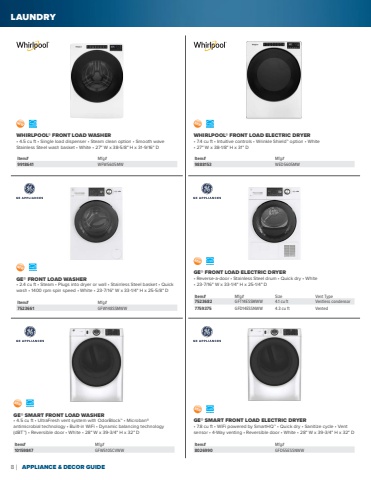 8 | APPLIANCE & DECOR GUIDE PRODUCT CATEGORYWHIRLPOOL® FRONT LOAD WASHER• 4.5 cu ft • Single load dispenser • Steam clean option • Smooth wave Stainless Steel wash basket • White • 27\Item# Mfg#9918641 WFW5605MWWHIRLPOOL® FRONT LOAD ELECTRIC DRYER• 7.4 cu ft • Intuitive controls • Wrinkle Shield™ option • White • 27\Item# Mfg#9888153 WED5605MWGE® FRONT LOAD WASHER• 2.4 cu ft • Steam • Plugs into dryer or wall • Stainless Steel basket • Quick wash • 1400 rpm spin speed • White • 23-7/16\Item# Mfg#7523661 GFW148SSMWWGE® FRONT LOAD ELECTRIC DRYER• Reverse-a-door • Stainless Steel drum • Quick dry • White • 23-7/16\Item# Mfg# Size Vent Type7523682 GFT14ESSMWW 4.1 cu ft Ventless condensor7759375 GFD14ESSNWW 4.3 cu ft VentedGE® SMART FRONT LOAD WASHER• 4.5 cu ft • UltraFresh vent system with OdorBlock™ • Microban® antimicrobial technology • Built-in WiFi • Dynamic balancing technology (dBT™) • Reversible door • White • 28\Item# Mfg#10159847 GFW510SCVWWGE® SMART FRONT LOAD ELECTRIC DRYER• 7.8 cu ft • WiFi powered by SmartHQ™ • Quick dry • Sanitize cycle • Vent sensor • 4-Way venting • Reversible door • White • 28\Item# Mfg#8026990 GFD55ESSNWWLAUNDRY