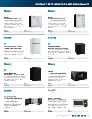 Log in to ferguson.com | 888-334-0004 | 9PRODUCT CATEGORYDANBY® COMPACT REFRIGERATOR• 1.6 cu ft • Mechanical thermostat • Crystal-clear glass front • Commercial rated beverage and food storage • Reversible door hinge • Black and stainless look trim • 17-11/16\20-1/4\Item# Mfg#7947894 DAG016A1BDBDANBY® COMPACT REFRIGERATOR• 2.6 cu ft • Mechanical thermostat • Crystal-clear glass front • Commercial rated beverage and food storage • Reversible door hinge • Black and stainless look trim • 17-1/2\19-11/16\Item# Mfg#7947888 DAG026A1BDBDANBY DESIGNER® 2-DOOR COMPACT REFRIGERATOR• Cycle defrost • 3.1 cu ft • Tall bottle storage • Clear vegetable crisper and cover • Reversible door hinge • White • 19-11/16\Item# Mfg#7221283 DCR031B1WDDDANBY DESIGNER® COMPACT ALL-REFRIGERATOR• 1.6 cu ft • Tall bottle storage • CanStor® beverage dispensing system • Reversible door hinge • Black • 17-11/16\x 20-1/16\Item# Mfg#7955859 DAR016B1BMDANBY DESIGNER® COMPACT ALL-REFRIGERATOR• 2.6 cu ft • Tall bottle storage • CanStor® beverage dispensing system • Reversible door hinge • Black • 17-18/25\26-15/16\Item# Mfg#7043668 DAR026A1BDDDANBY® COUNTERTOP MICROWAVE• 1.1 cu ft • Wattage: 1,000W • 10 Power levels • Simple one-touch cooking • Easy-to-read LED timer/clock • Black • 21-11/50\11-81/100\Item# Mfg#8261761 DBMW1120BBBDANBY DESIGNER® COUNTERTOP MICROWAVE• 1.1 cu ft • Wattage: 1,000W • 10 Power levels • Simple one-touch cooking • Easy-to-read LED timer/clock • Stainless Steel • 21-11/50\15-47/50\Item# Mfg#8261760 DDMW1125BBSSHARP® DIAL TIMER COMMERCIAL MICROWAVE• Watts: 1,000W • Light-up 6-minute electronic dial timer • Heating time guide • Auto cancel • 100% only power level • Stainless Steel interior and door • 20-1/2\Item# Mfg#5077148 R-21LCFSCOMPACT REFRIGERATORS AND MICROWAVES