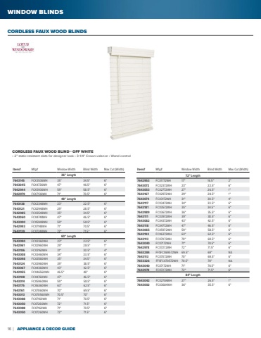 16 | APPLIANCE & DECOR GUIDE PRODUCT CATEGORYCORDLESS FAUX WOOD BLINDSCORDLESS FAUX WOOD BLIND - OFF WHITE• 2\Item# Mfg# Window Width Blind Width Max Cut (Width)36\7643145 FCX3536WH 35\34.5\ 6\7643045 FCX4736WH 47\46.5\ 6\7642944 FCX5936WH 59\58.5\ 6\7642979 FCX7136WH 71\70.5\ 6\48\7643138 FCX2348WH 23\22.5\ 6\7643121 FCX2948WH 29\28.5\ 6\7642985 FCX3548WH 35\34.5\ 6\7643060 FCX4748WH 47\46.5\ 6\7643000 FCX5948WH 59\58.5\ 6\7642993 FCX7148WH 71\70.5\ 6\7643139 FCX7248WH 72\71.5\ 6\60\7643090 FCX2360WH 23\22.5\ 6\7642961 FCX2960WH 29\28.5\ 1\7643186 FCX3160WH 31\30.5\ 4\7643008 FCX3460WH 34\33.5\ 6\7643098 FCX3560WH 35\34.5\ 6\7643124 FCX3960WH 39\38.5\ 6\7643067 FCX4360WH 43\42.5\ 6\7642955 FCX46560WH 46.5\46\ 6\7643108 FCX4760WH 47\46.5\ 6\7643014 FCX5960WH 59\58.5\ 6\7643175 FCX6360WH 63\62.5\ 6\7643161 FCX7060WH 70\69.5\ 6\7643013 FCX70560WH 70.5\70\ 6\7643088 FCX7160WH 71\70.5\ 6\7643050 FCX7260WH 72\71.5\ 6\7643088 FCX7160WH 71\70.5\ 6\7643050 FCX7260WH 72\71.5\ 6\Item# Mfg# Window Width Blind Width Max Cut (Width)72\7642953 FCX1772WH 17\16.5\ 2\7643072 FCX2372WH 23\22.5\ 6\7643053 FCX2772WH 27\26.5\ 1\7643167 FCX2972WH 29\28.5\ 1\7643074 FCX3172WH 31\30.5\ 4\7643117 FCX3472WH 34\33.5\ 6\7643181 FCX3572WH 35\34.5\ 6\7642989 FCX3672WH 36\35.5\ 6\7643111 FCX3972WH 39\38.5\ 6\7643082 FCX4372WH 43\42.5\ 6\7643118 FCX4772WH 47\46.5\ 6\7643065 FCX5972WH 59\58.5\ 6\7643193 FCX6372WH 63\62.5\ 6\7643113 FCX7072WH 70\69.5\ 6\7643040 FCX7172WH 71\70.5\ 6\7642978 FCX7272WH 72\71.5\ 6\7653284 FFSFCX69572WH 69.5\69\ NA7643113 FCX7072WH 70\69.5\ 6\7653326 FFSFCX70572WH 70.5\70\ NA7643040 FCX7172WH 71\70.5\ 6\7642978 FCX7272WH 72\71.5\ 6\84\7643042 FCX2784WH 27\26.5\ 1\7643002 FCX3684WH 36\35.5\ 6\WINDOW BLINDS