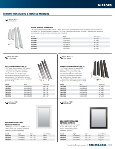 Log in to ferguson.com | 888-334-0004 | 23MIRROR FRAME KITS & FRAMED MIRRORSWHITE MIRROR FRAME KIT• (4) Precut white wrapped MDF pieces • Hides mirror clips and blemishes • Easy assembly with included bow tie connectors and double-sided adhesive • Includes low-profile mirror clips and glue • Polyurethane adhesive recommended for permanent installation (not included) Item# Mfg# Dimension7628587 OK2436N271 24\7628585 OK3036N271 30\7628597 OK3636N271 36\7628582 OK4236N271 42\7628570 OK4836N271 48\7628590 OK6036N271 60\SILVER MIRROR FRAME KIT• (4) Precut silver wrapped MDF pieces • Hides mirror clips and blemishes • Easy assembly with included bow tie connectors and double-sided adhesive • Includes low-profile mirror clips and glue • Polyurethane adhesive recommended for permanent installation (not included) Item# Mfg# Dimension7628588 OK2436N272 24\7628591 OK3036N272 30\7628598 OK3636N272 36\7628419 OK4236N272 42\7628571 OK4836N272 48\7628592 OK6036N272 60\ESPRESSO MIRROR FRAME KIT• (4) Precut espresso wrapped MDF pieces • Hides mirror clips and blemishes • Easy assembly with included bow tie connectors and double-sided adhesive • Includes low-profile mirror clips and glue • Polyurethane adhesive recommended for permanent installation (not included) Item# Mfg# Dimension7628589 OK2436N278 24\7628575 OK3036N278 30\7628594 OK3636N278 36\7628583 OK4236N278 42\7628573 OK4836N278 48\7628586 OK6036N278 60\DECORATIVE FRAMED BEVELED MIRROR• White paper-wrapped 3\• 3/16\mounting hardware attached Item# Mfg# Size Frame Material8879802 FE2436B112 24\ 3\8879806 FE3036B112 30\ 3\8879805 FE3636B112 36\ 3\DECORATIVE FRAMED BEVELED MIRROR• Espresso lacquer 2.5\frame • 3/16\bevel • Standard mounting hardware attached Item# Mfg# Size Frame Material8879803 FE2436B311 24\ 2.5\8879807 FE3036B311 30\ 2.5\8879804 FE3636B311 36\ 2.5\MIRRORS