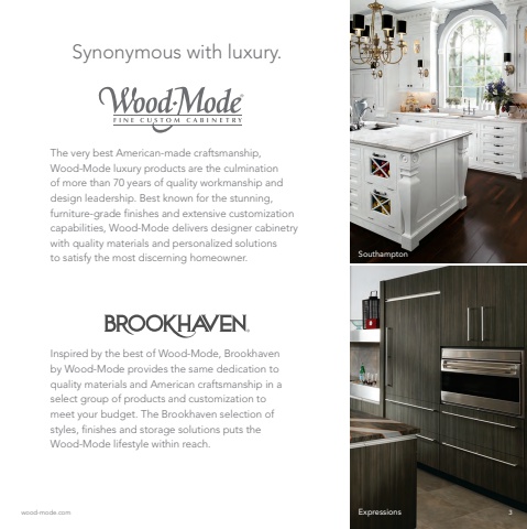 wood-mode.com Synonymous with luxury.The very best American-made craftsmanship, Wood-Mode luxury products are the culmination of more than 70 years of quality workmanship and design leadership. Best known for the stunning, furniture-grade finishes and extensive customization capabilities, Wood-Mode delivers designer cabinetrywith quality materials and personalized solutions to satisfy the most discerning homeowner.Inspired by the best of Wood-Mode, Brookhaven by Wood-Mode provides the same dedication to quality materials and American craftsmanship in a select group of products and customization to meet your budget. The Brookhaven selection of styles, finishes and storage solutions puts the Wood-Mode lifestyle within reach.3SouthamptonExpressions