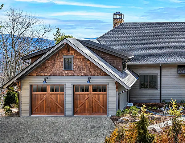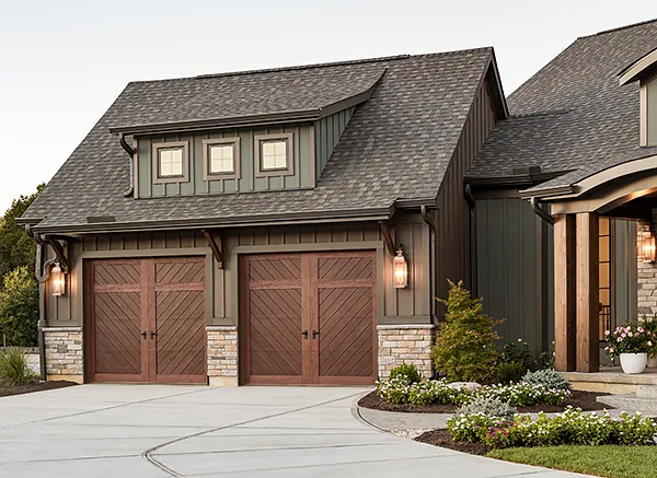 Preferred for formal and historical house styles—like colonial and Victorian—as well as many other popular favorites—like cottage, farmhouse, and Craftsman designs—carriage house garage doors come in a wide range of looks. Their diversity comes from their structure, with overlays arranged over the base in a variety of ways. Simple carriage house doors have overlays around the edges while more complex designs place additional overlays across the door.