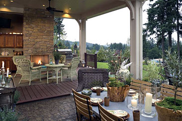 Bring your living room amenities outside — stereos, outdoor televisions, your reading chair and lamp and relax in the cool summer evening air in front of a warm fire.