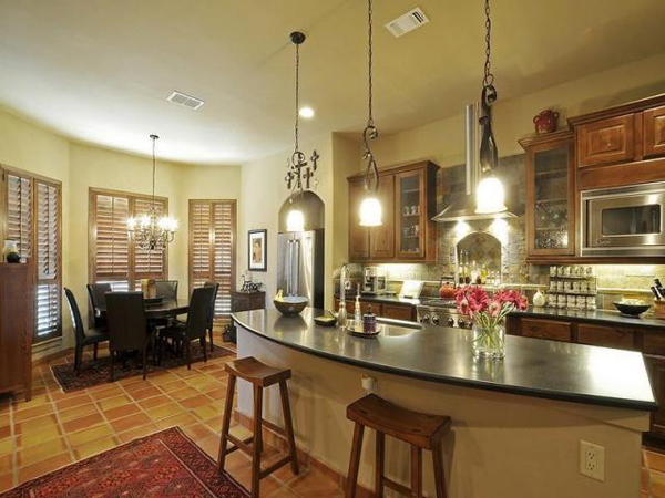 This LAMPS PLUS® kitchen features elegant iron oxide finish pendant lights that add a feminine touch to the weighty oak cabinetry while still maintaining the welcoming aura created by the warm woods.