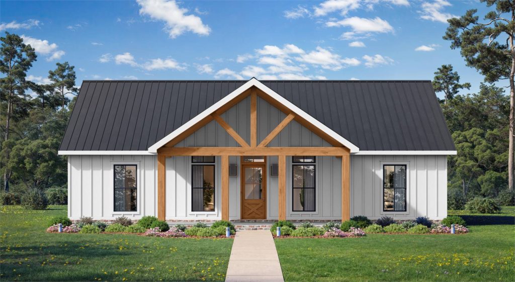 If you’re after simplicity with style, Plan 11024 delivers. With 3 bedrooms, 2 baths, and 1,450 square feet, this barndominium-inspired design is efficient and beautiful. The vaulted great room and cathedral front porch make it easy to gather and enjoy summer days. Perfect for downsizers or anyone seeking a compact home with character.