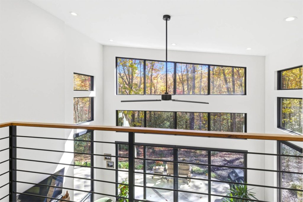 This open living area is designed to feel bright, spacious, and connected to the outdoors. Tall windows and glass doors bring in tons of daylight while creating a strong visual connection to the patio and surrounding views.