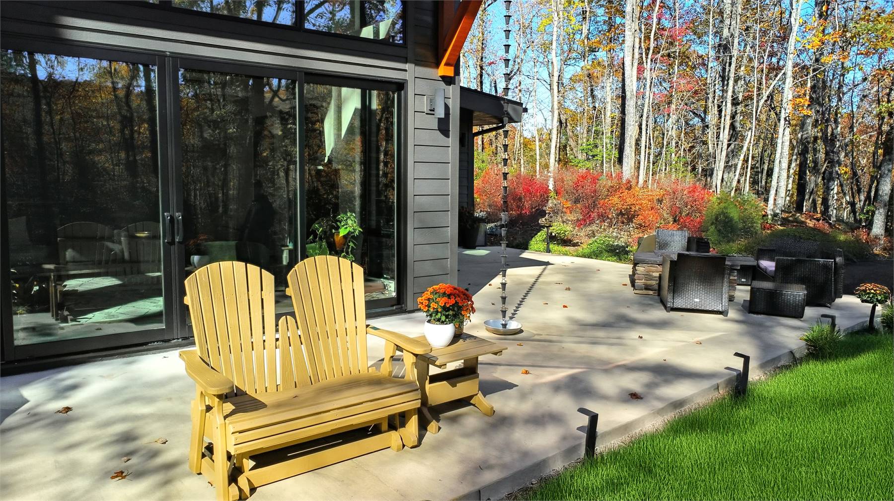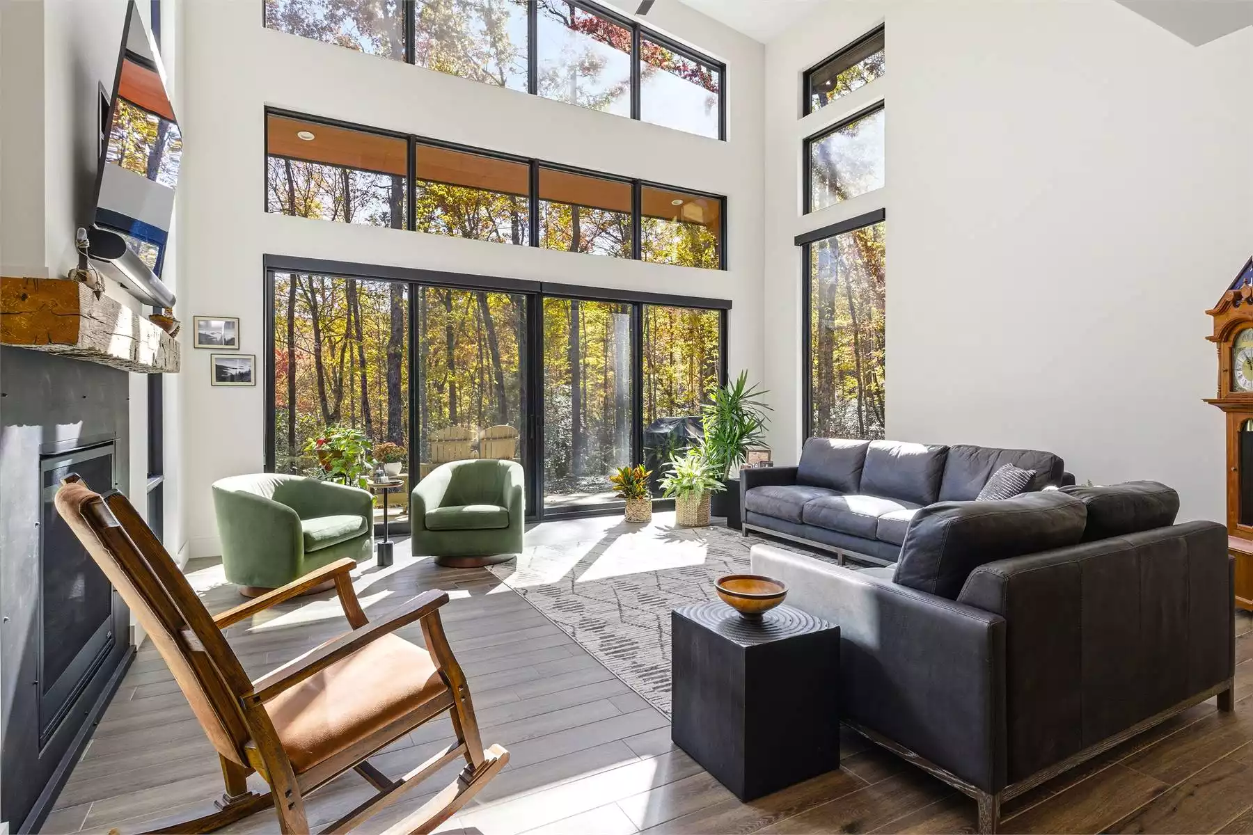 This open living area is designed to feel bright, spacious, and connected to the outdoors. Tall windows and glass doors bring in tons of daylight while creating a strong visual connection to the patio and surrounding views.