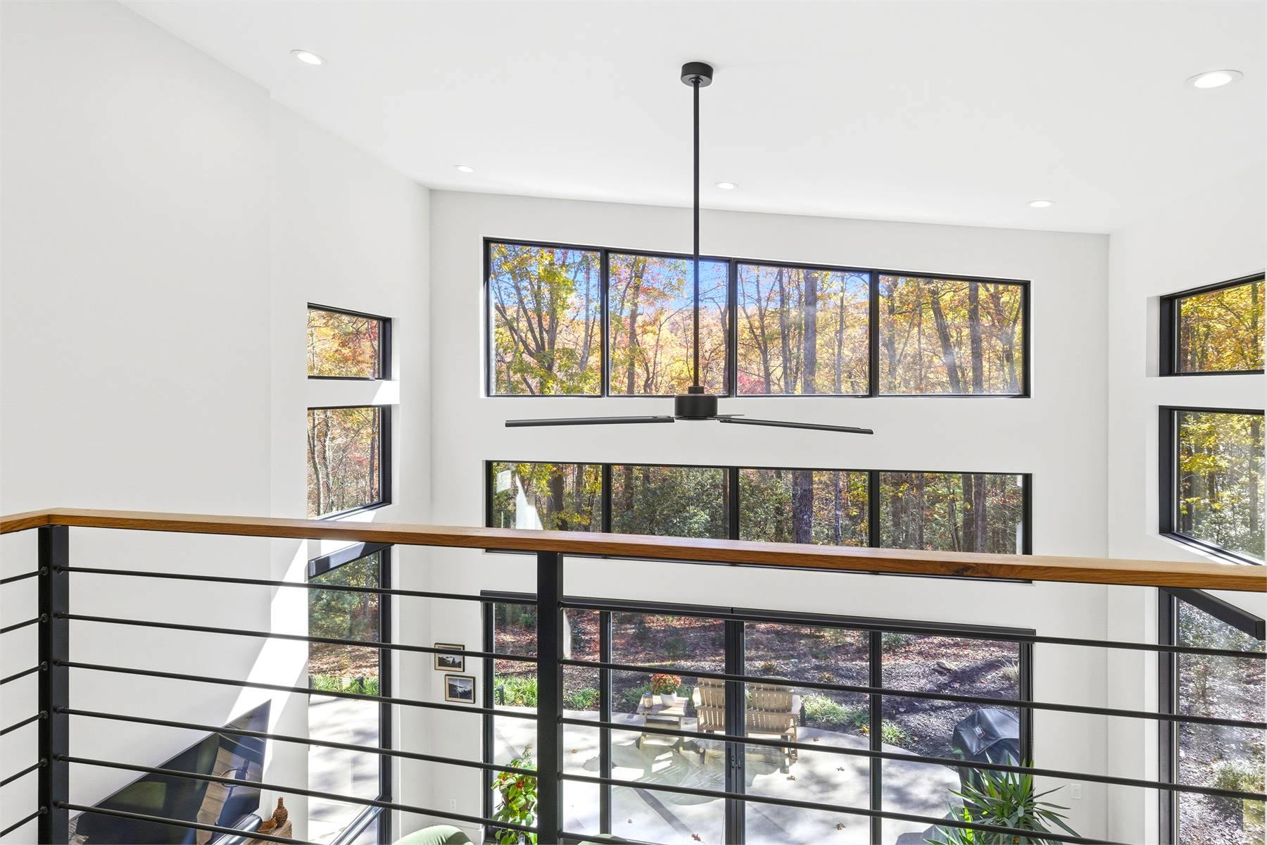 This plan isn’t just conceptual. The photos and video tour featured in this post come from a real client build by Tim and Cindy, who brought this design to life on a beautiful wooded lot in North Carolina. Their finished home is a perfect example of how this plan’s dramatic windows, clean rooflines, and indoor/outdoor flow can shine in a natural setting.