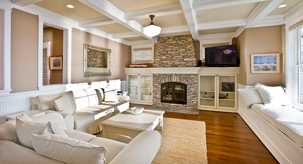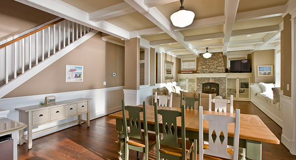 Explore the first floor plan of the Veranda Bay House Plan 3352, a well-designed narrow lot home, perfect for a waterfront property.An open living space allows for plenty of room for entertaining.A large great room with fireplace and window seating is the highlight of this open floor plan called the Veranda Bay Beach House Plan.A classic beach house plan kitchen featuring plenty of earth tone cabinets and rich wood floors.Kids will love their own private pad with two bunk rooms and a large game room with kitchenette.A view of the second story media room with kitchen and plenty of cozy nooks and built-ins from the Veranda Bay House Plan 3352.