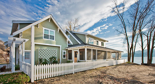 The Veranda Bay House Plan is a perfect design for a narrow waterfront property. It’s 46′ wide and features a wrap around veranda, two car garage and large open living space.