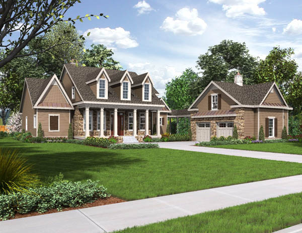 Here is one of our many great examples of a best-selling home that features its own detached garage as part of the blueprints. This wonderfully luxurious cottage-style home provides ample space and comfort, while the detached garage provides even more in the form of guest quarters.
