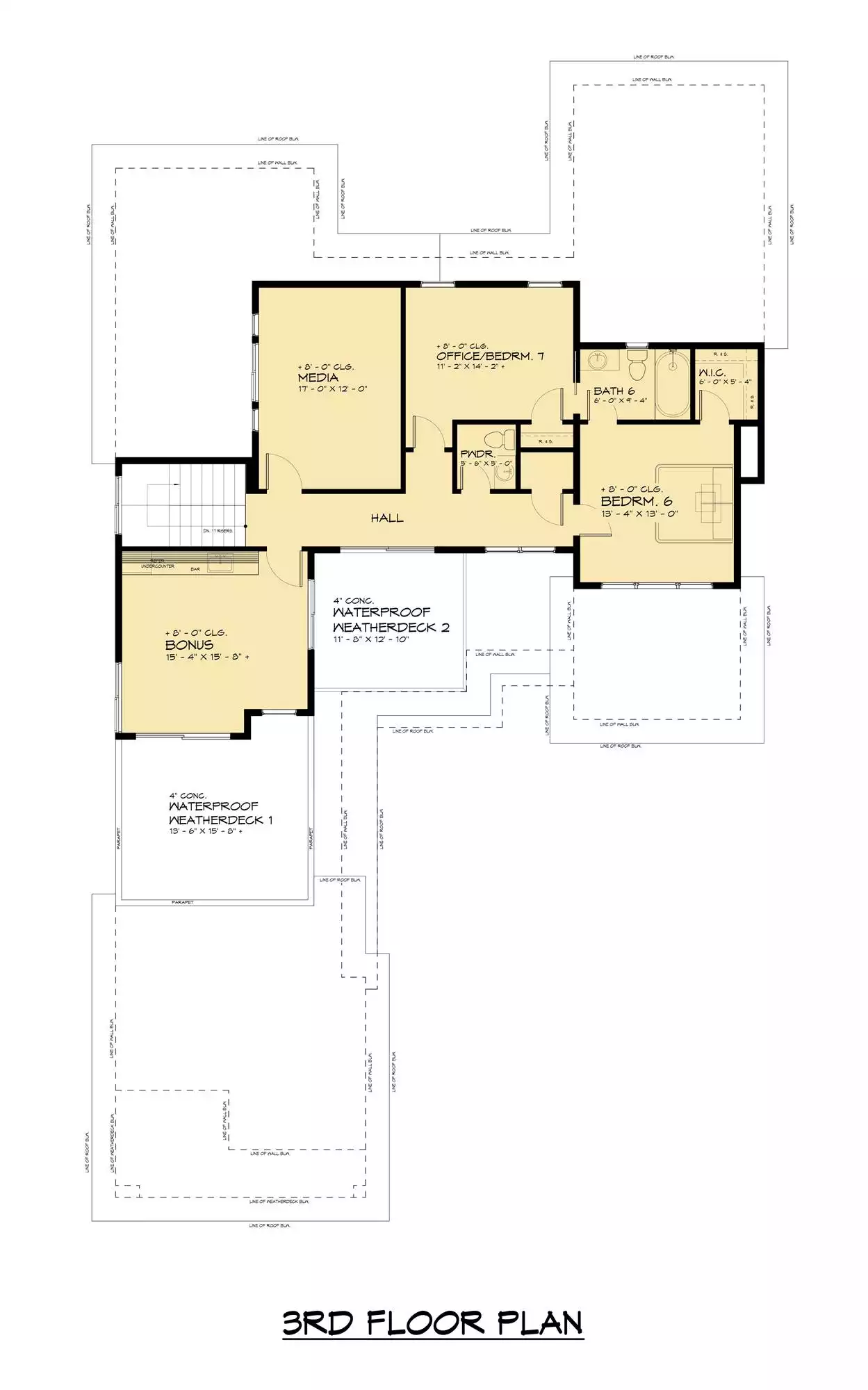 Next, let’s check out a modern home, THD-6025. This gorgeous design features bedrooms on three levels! A beautiful 5-piece guest suite on the main floor could serve in-laws or even the owners. Upstairs, the magnificent master bedroom is in its own wing, separated from another bedroom by the master bath, two closets, and a stairway for amazing separation. The other bedrooms on this floor are on other side of the home, connected by a bridge. Finally, the last two bedrooms sit on the third level with media and bonus space. Talk about spreading out!