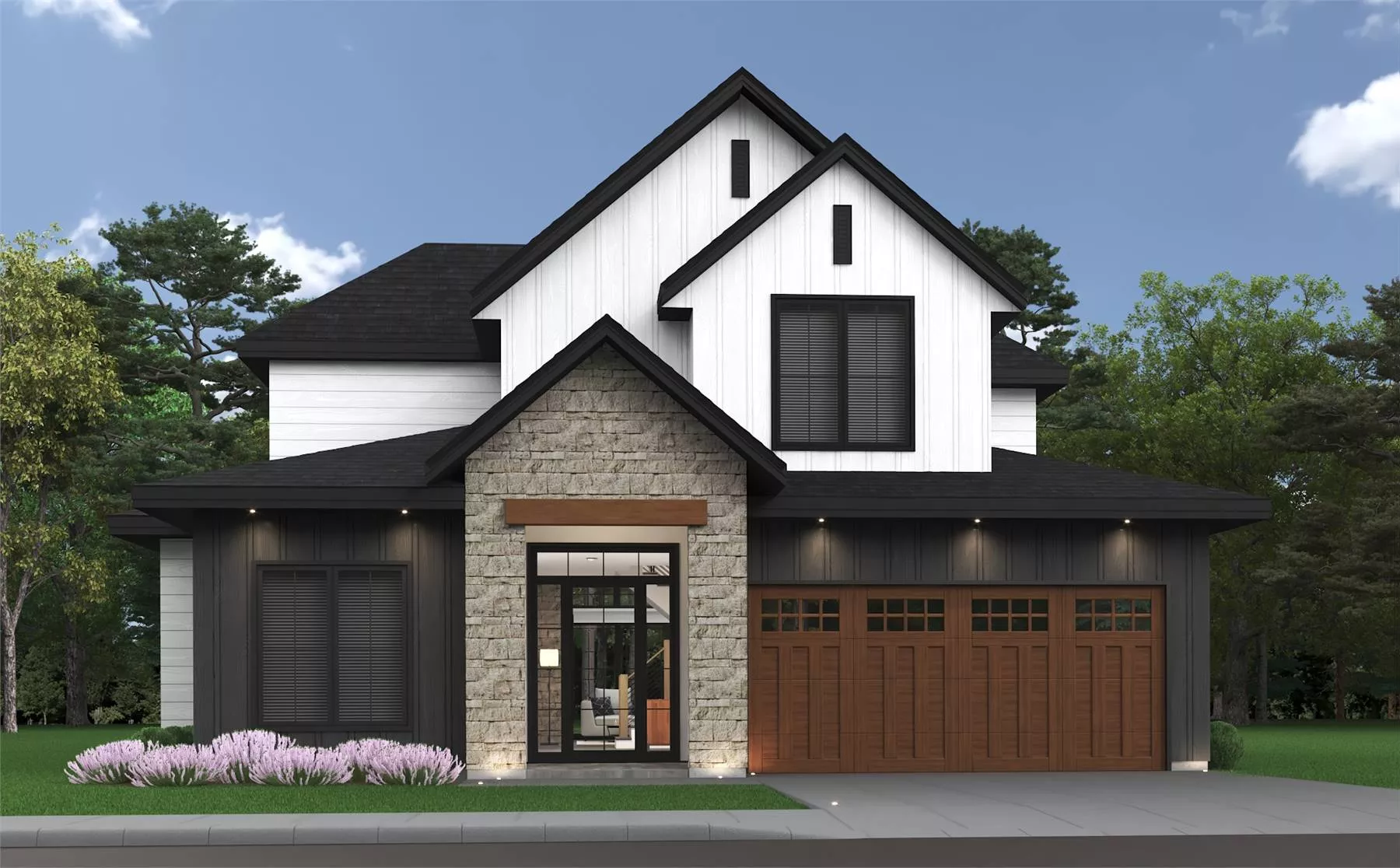 The Brook Farm II seamlessly blends modern comforts with farmhouse charm, evident from the moment you encounter its exterior. Wood and stone blend to create an attractive visual effect, offering balance for those seeking a natural touch. We selected a Clopay® Canyon Ridge® Carriage House garage door to provide an authentic farmhouse feel with a gorgeous, low-maintenance faux wood finish.