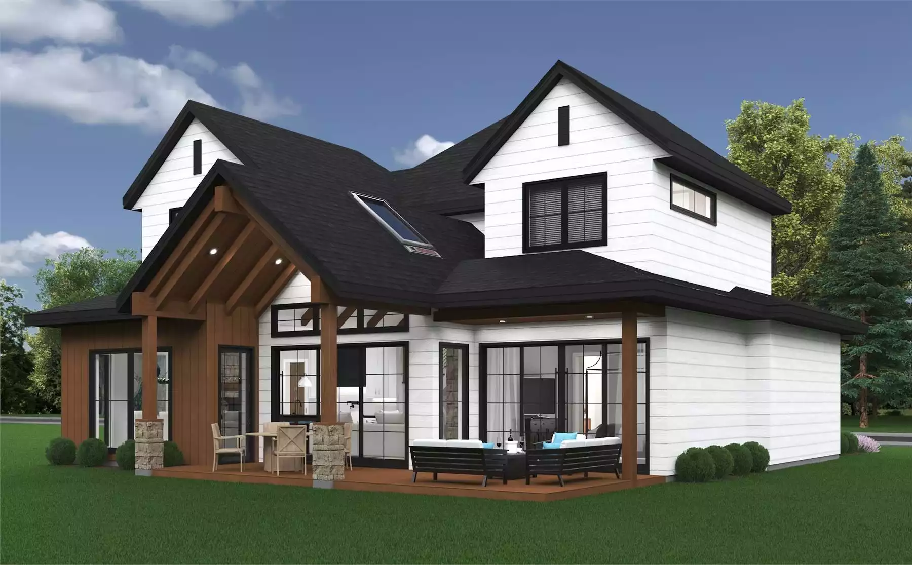 An alluring outdoor living space embellishes the rear of the home, optimizing the area for cherished family gatherings. Abundant glass from the Pella® Impervia® Windows to the Therma-Tru® Veris™ Sliding Glass Doors enhance modern appeal and ensure lasting durability and energy efficiency. They also welcome warmth indoors, seamlessly integrating the outdoors with the essential living spaces.