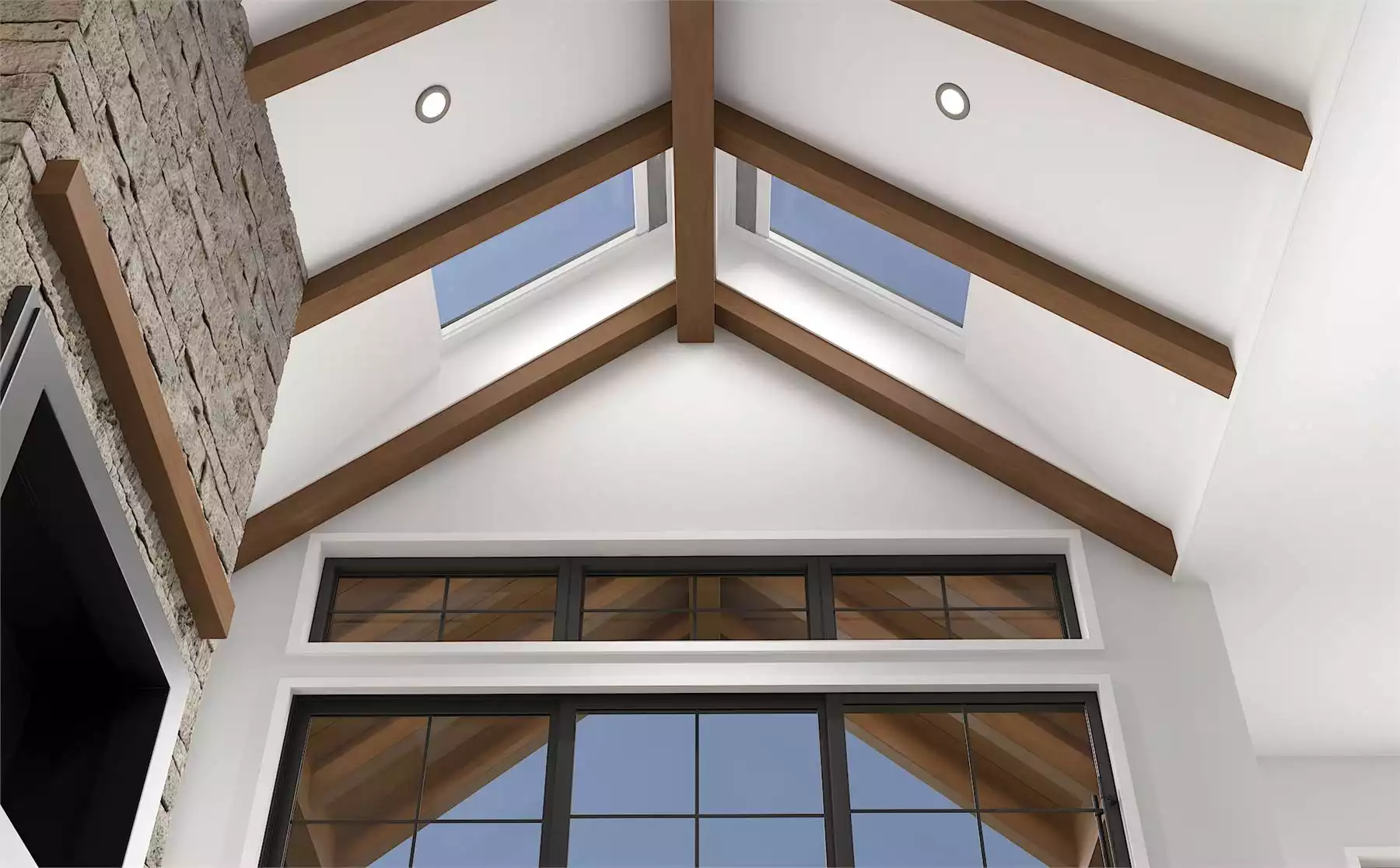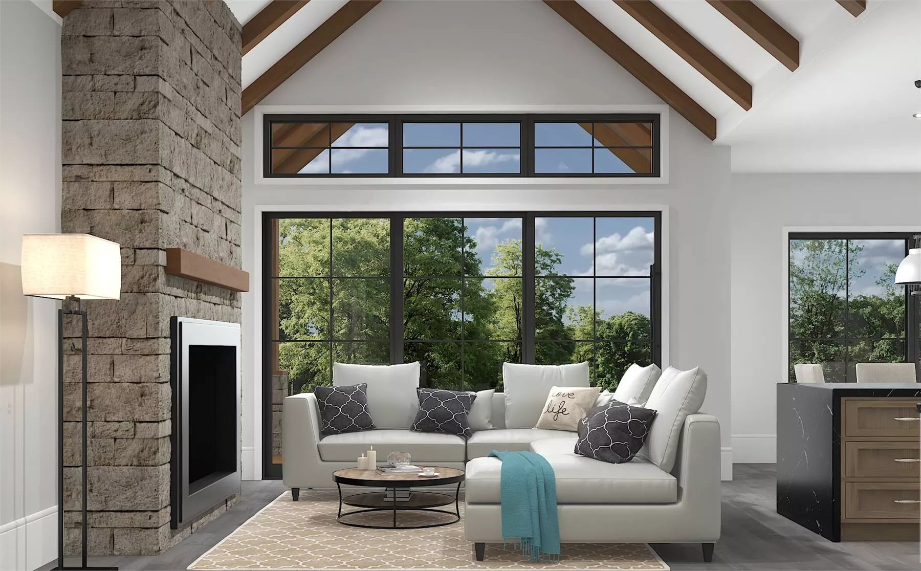At the heart of the residence, an open floor plan invites with a bright and airy ambiance. Large windows and architect-preferred VELUX® Skylights work harmoniously to illuminate the living room, creating a sense of spaciousness while infusing warmth. That warmth is supported by the fireplace adorned with Cultured Stone Hewn Stone, which further infuses natural beauty into the space. Just imagine spending cozy nights with the family here!