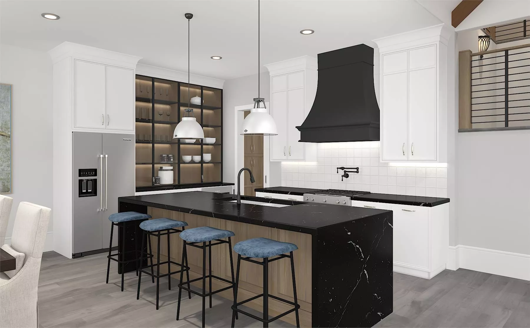 The kitchen is designed for exceptional culinary experiences, with a view extending to both the living and dining areas. This ensures that even during busy dinner preparations, connection is maintained. The kitchen island is equipped with seating, fostering an inclusive atmosphere. KitchenAid® appliances, known for their sleek aesthetics and reliability, seamlessly integrate into the space, adding a touch of continued elegance.