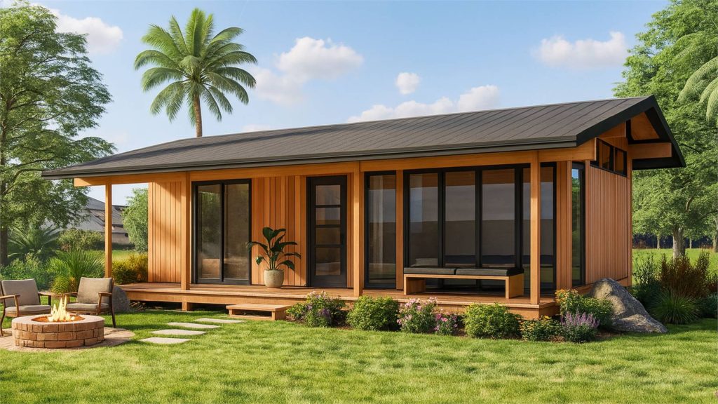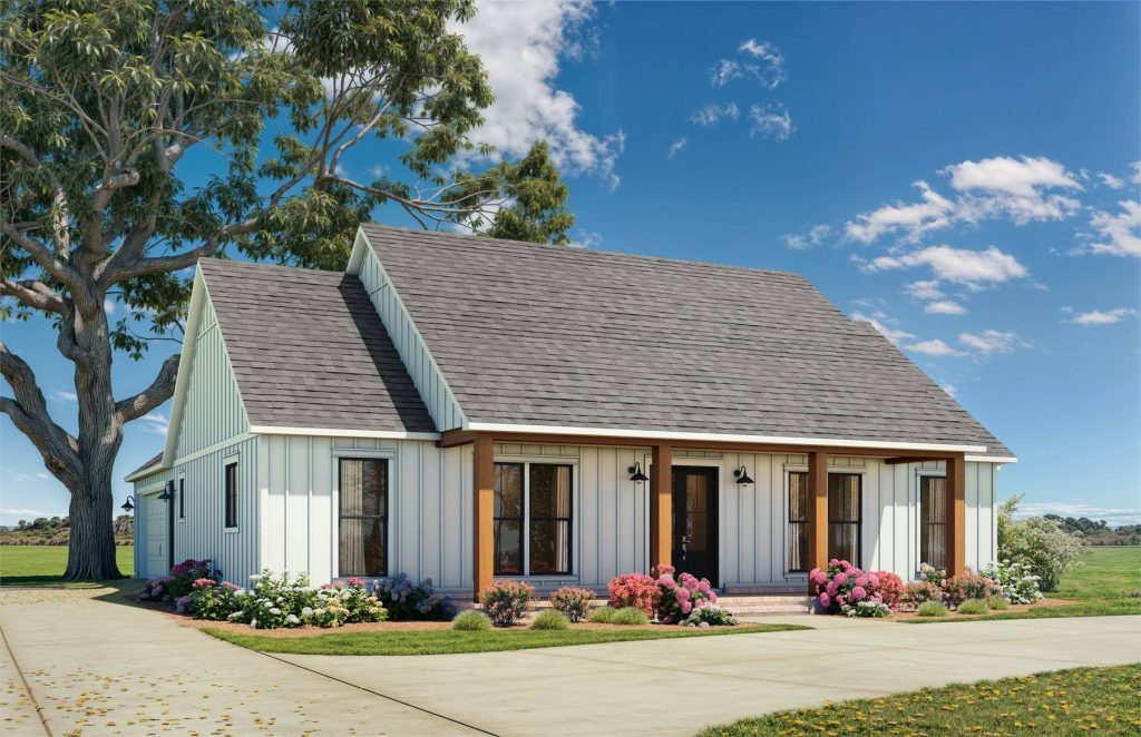For those who love minimalist living or need a guest house, the Puna Retreat is a stunning tropical design. With just 507 sq. ft., 1 bedroom, and 1 bath, this small house plan feels much bigger thanks to a vaulted ceiling, sleek exterior, and expansive covered porch. This plan is perfect for those seeking small but functional.