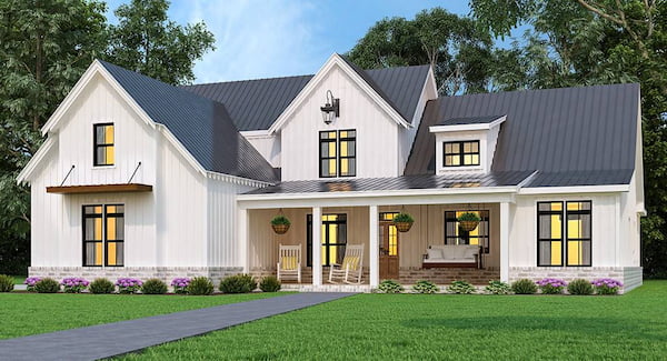 The unique layout of House Plan 8861 makes it perfect for a lot with a view to the side. When you enter this 2,224-square-foot home, the kitchen and dining space are up front, with the vaulted great room with large windows adjacent. The master suite is in back, also with plenty of windows and a four-piece bath. Three bedrooms, a hall bath, and a bonus over the garage give the kids tons of space to enjoy upstairs!