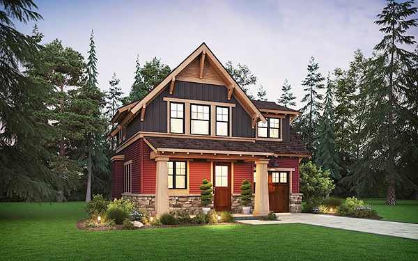 House Plan 6585 has 1,176 square feet, a simple footprint, and a high-impact exterior design for plenty of curb appeal. The main level consists of a U-shaped kitchen beside totally open living space, a powder room, a laundry closet, and a one-car garage. The four-piece master suite and two bedrooms that share a hall bath are upstairs along with a sunny reading nook!
