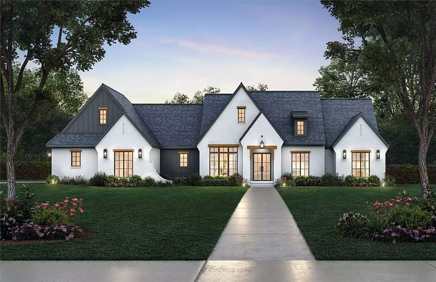 Rather build down than up? Check out House Plan 6954, which offers tons of potential across the main level and the finished basement! The first floor is centered around the sunny great room and the dramatic U-shaped kitchen and dining that sit beneath a cathedral vaulted ceiling. Make sure to check out the hidden chef's kitchen, too! The luxe five-piece primary suite and the office sit on one side of this while a smaller suite and the mudroom coming in from the garages—a two-car and a tall garage for an RV—are on the other. Downstairs, you'll find two more bedrooms, a hall bath, a rec room with a bar, and a workout room!