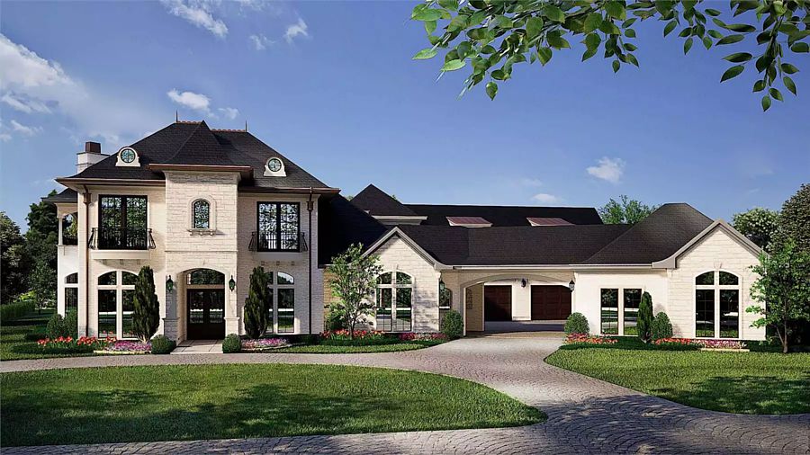 If you need a sprawling Mediterranean design to impress your most discerning clients, make sure to show them House Plan 10394. This grand home boasts 4,805 square feet with five bedrooms and five-and-a-half baths on two stories, plus it has garage parking for seven across the motorcourt accessible through the portico on the side. The main level has a formal feel with a study and dining room flanking the foyer, a U-shaped kitchen with a breakfast nook, and a family room with a corner fireplace. The amazing primary suite has dual vanities, a corner stall shower, a freestanding tub, two toilet closets, and two walk-in closets. A guest suite, the laundry room, and a powder room with indoor/outdoor access to serve the expansive outdoor living areas round out this floor. But wait—the curved staircase to the second level has wine storage beneath it! You'll find three bedroom suites, a game room with a balcony, a media room, and a future bonus room upstairs. This layout gives every member of the family plenty of their own space!