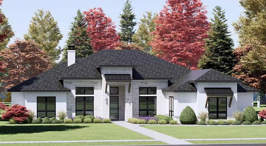 With chic hipped rooflines and an updated Mediterranean design, House Plan 8452 is made for the Sun Belt! Inside, you'll find 3,621 square feet across one level, with four bedrooms, three-and-a-half baths, and more. Beside the foyer, there's a flex room that you could make an office, study space, or formal living room. The great room farther inside is totally open concept and has a cathedral vaulted ceiling that spans the whole room, from the fireplace to the island kitchen. The primary suite off the kitchen has a pyramid vaulted ceiling in the bedroom, a large five-piece bath, and a walk-in closet with direct access to the laundry room. Off the living area, two bedrooms share a Jack-and-Jill bath—with private powder room accommodations!—while the third is beside a hall bath. But that's not all—a game room in back expands the possibilities!