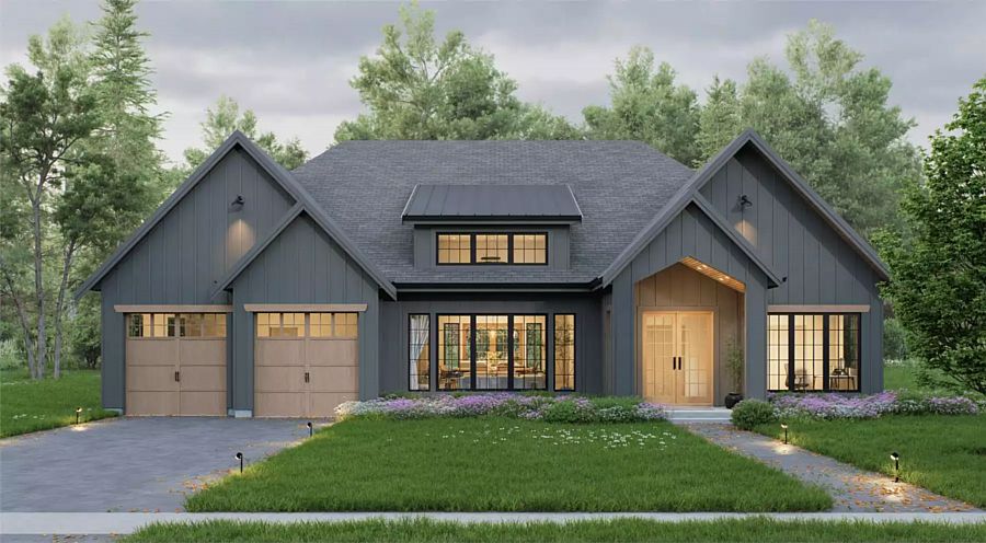 House Plan 11148 comes in at 2,692 square feet with three bedrooms and three-and-a-half bathrooms, but that's not the half of it! This unique layout has so much to appreciate, starting at the vaulted foyer with a closet straight ahead, an office on one side, and the great room on the other. What a nifty way to define work from family time! The great room is totally open, with living space with a hearth in front, dining in the middle, and an island kitchen in back. And check out that prep kitchen tucked off the side that connects through to the grilling patio, which is in addition to the covered rear patio with an outdoor fireplace! Two bedroom suites and the powder room are placed off the hall on one side while the luxe primary suite enjoys privacy and easy access to the mudroom and laundry room on the other.