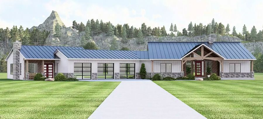 House Plan 11486 offers long and low country ranch curb appeal with a modern layout. Totaling 3,064 finished square feet, you'll find 2,030 square feet with three bedrooms and two bathrooms spread around a cathedral vaulted great room in the main house. Make sure not to miss the large walk-in pantry behind the island kitchen, the spacious laundry room with a shower, or that the living/dining space connects through to outdoor living beneath a cathedral ceiling, too. The 1,034-square-foot apartment is attached on the opposite side of the three-car garage and includes its own open great room with an island kitchen, a bedroom suite, a powder room, a mudroom, and laundry.