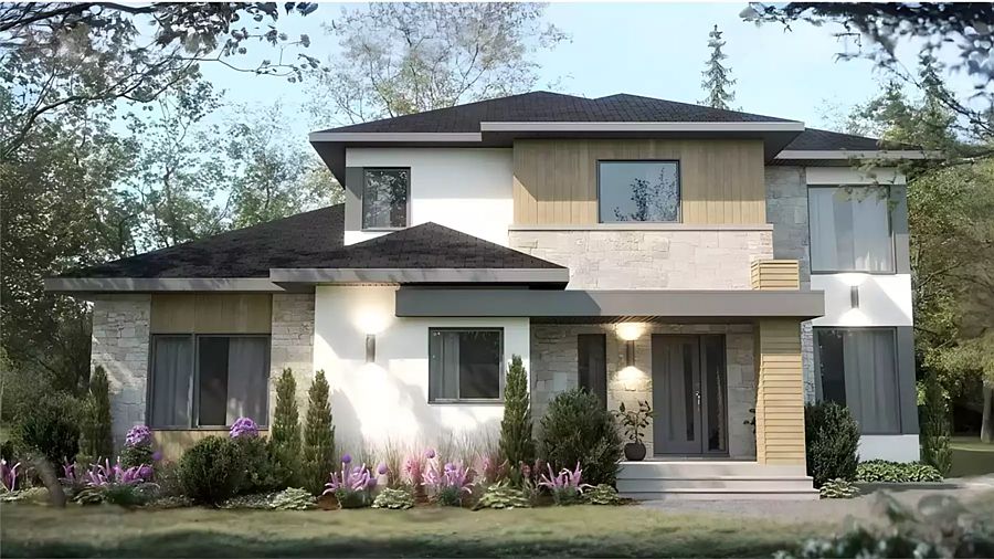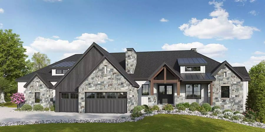 House Plan 10857 is a unique one for sure! It offers 3,857 square feet across the main floor, which includes a front-entry unit and a side-entry unit. The front-entry home offers a foyer flanked by an office and a mudroom that connects to its three-car garage while the open-concept great room with an island kitchen and the five-piece primary suite with its own sun room are in back. On the side-entry part of the house, you'll find another open-concept great room, a four-piece primary suite, a guest bedroom, and a mudroom that connects to the side-entry two car garage. Both units come together in the formal dining room behind barn doors—perfect for family meals! If you choose to finish the basement—accessible from staircases on both sides, of course—you can add three more bedrooms, a huge rec room, and a third laundry set.