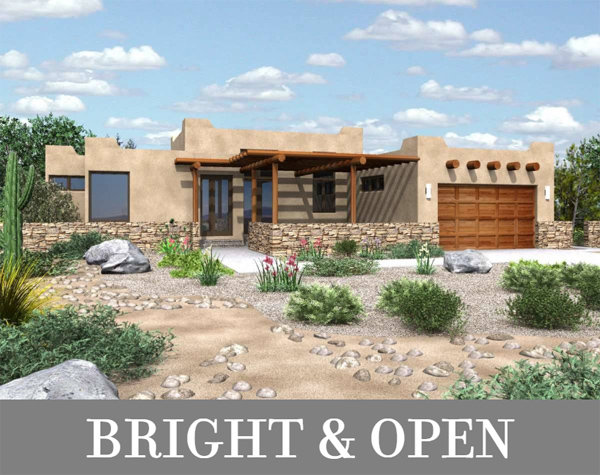 The Queensbury plan is a long and low ranch with striking style perfect for the Southwest, where so many retirees head these days. It offers two split bedrooms, a den, and a wide open floor plan. It also has windows in abundance, including around corners, for a super bright design from all sides!