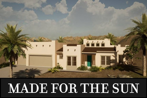 With Southwestern design elements under a striking contemporary roofline, House Plan 8679 offers unique curb appeal. Inside, it impresses with naturally bright open living spaces, a fully apportioned master suite, two bedrooms in a Jack-and-Jill setup, and a guest room and a study off the foyer.