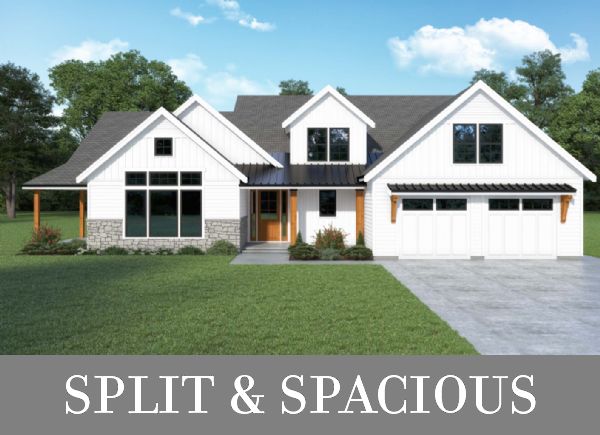 House Plan 9809 has 1,935 square feet and an adorable exterior design complete with gables, dormers, and porches—the perfect look for the countryside! The first floor includes open-concept living space on one side and the master suite, another bedroom, and a bathroom in a hallway on the other. You'll find a spacious loft area and third bedroom with an ensuite bath upstairs to round out this lovely home.