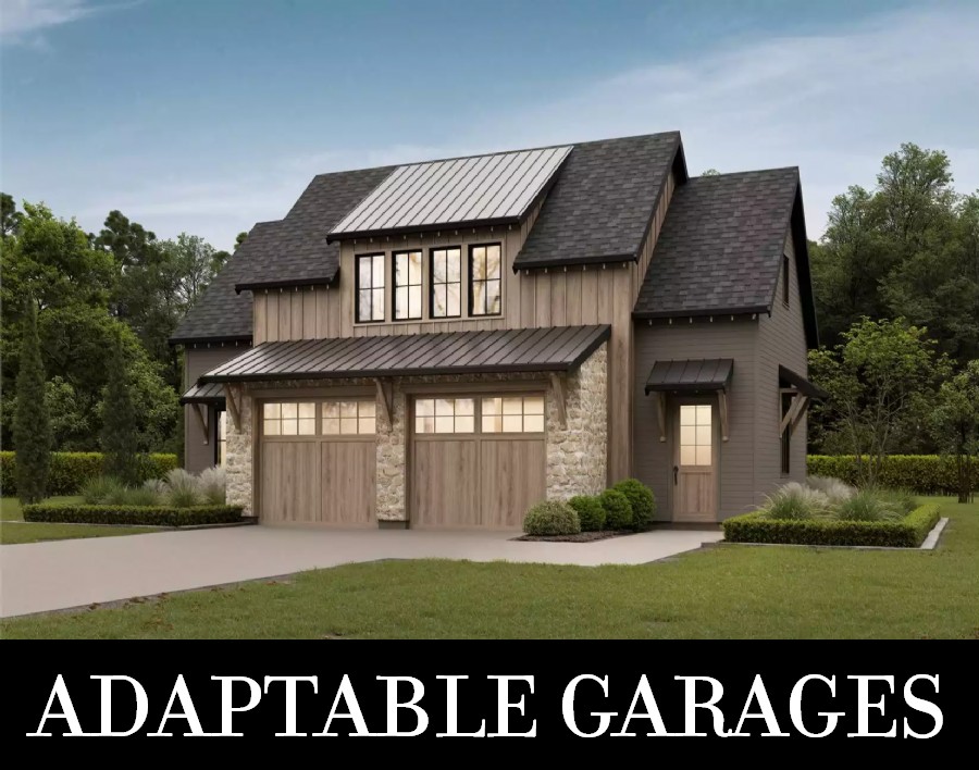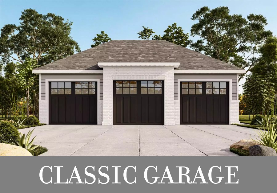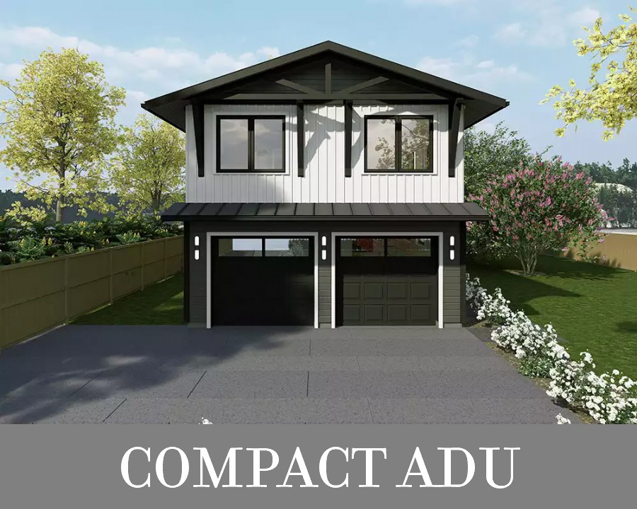 Ideal for narrower building plots, Plan 9039 offers garage parking for two and a 781-square-foot apartment within a 23'9" by 40' footprint. The apartment has exterior access in back, with stairs on the patio leading up to the covered deck and entry. Inside, you'll find open-concept living with an island kitchen, gas fireplace, and skylights. There's one bedroom called out on the plans as well as a nursery you could use as a second bedroom or office. One full bath and stacked laundry round out this lovely unit!