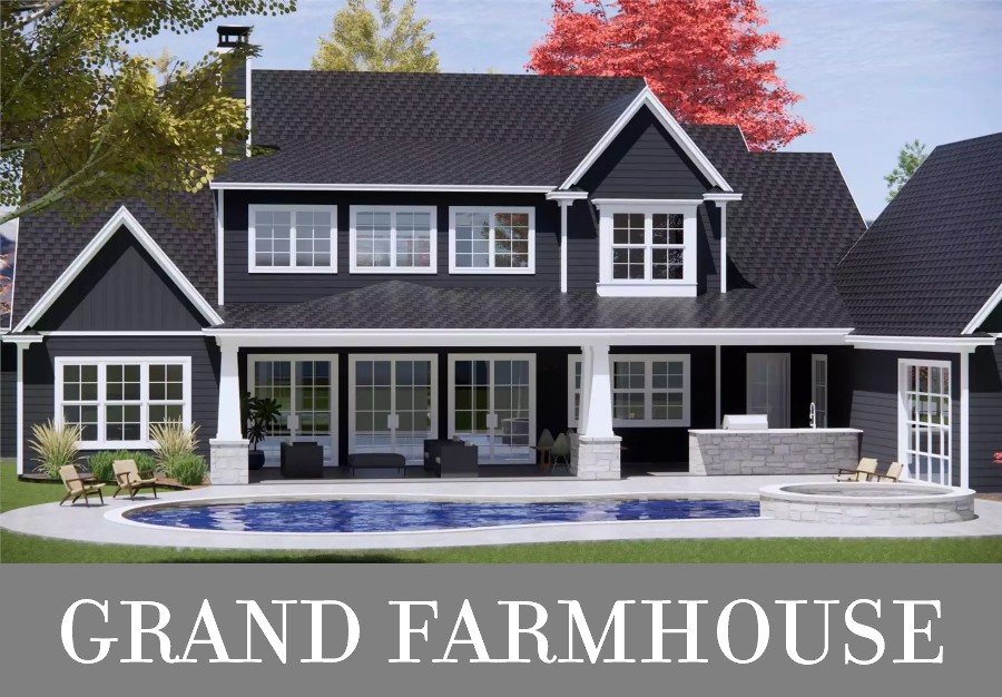 House Plan 6792 is a two-story farmhouse with 3,938 square feet, voluminous living, a main-level primary suite, and three more suites upstairs. You'll also appreciate having an office and a large family foyer/mudroom lined with lockers and cabinets! The back porch connects to the main living area with three sets of French doors for an open yet traditional feel. There's an outdoor kitchen and plenty of room for patio furniture, but that's not all—there's direct exterior access to the powder room that also connects to the mudroom on the other side. What a convenient feature for backyard hosting!