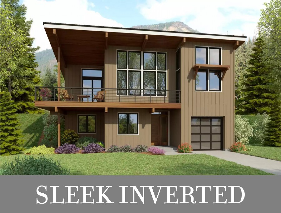House Plan 9416 is a unique contemporary design ideal for a view lot thanks to its inverted layout that boosts the main living areas—and the deck—for higher, clearer sightlines. It offers a modest 1,707 square feet and is made for a sloping lot, so it'd also make a great choice for a vacation property! Inside, the main level includes a foyer that the one-car garage also enters into, two bedrooms, a hall bath, and the laundry. Upstairs, you'll enjoy a four-piece primary suite, open-concept living, and the powder room. Make sure to notice the vaulted ceilings in the bedroom, dining, and living area, as well as the stylish exposed structural beams!