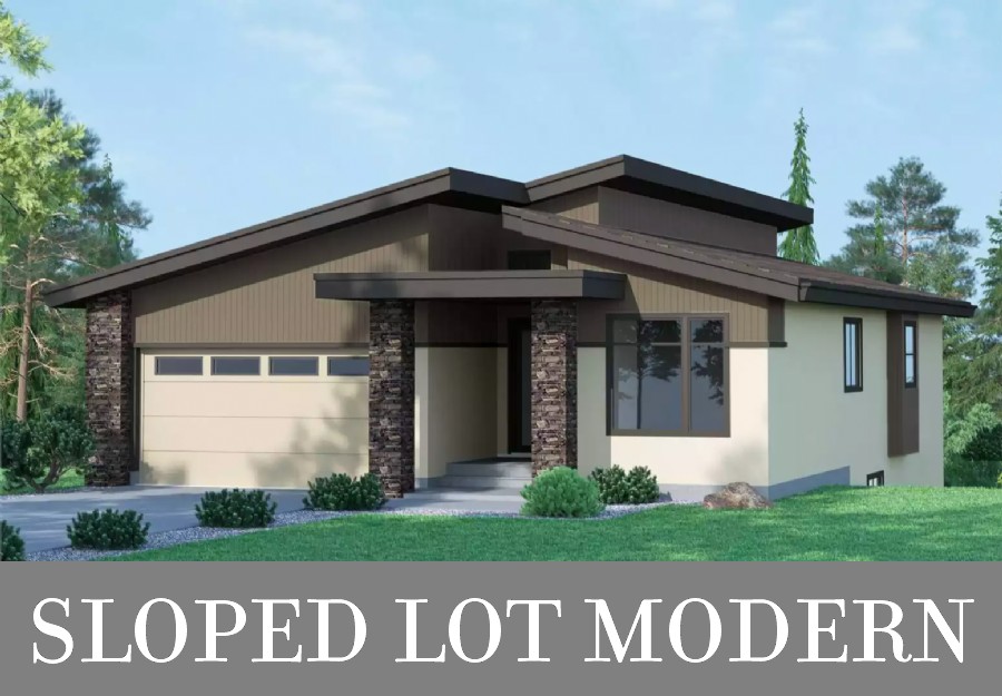 House Plan 2863 is a modest modern home of 1,646 square feet with a neat, compact shape and shed rooflines for curb appeal. The layout places two bedrooms and a hall bath off the foyer while the open great room spreads out in back. The rear hallway hosts the private primary suite, complete with a five-piece bath. This design comes with an unfinished basement foundation—perfect for adapting to a sloping lot and finishing in the future, should you like!