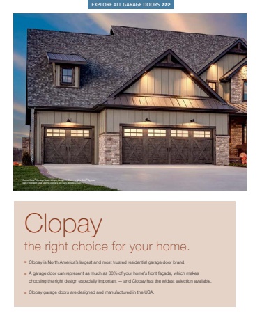 ■ Clopay is North America’s largest and most trusted residential garage door brand.■ A garage door can represent as much as 30% of your home’s front façade, which makeschoosing the right design especially important — and Clopay has the widest selection available.■ Clopay garage doors are designed and manufactured in the USA.Clopay the right choice for your home. Canyon Ridge® Carriage House 4-Layer, Design 21; Shown in Ultra-Grain® CypressSlate Finish with Clear Cypress Overlays and SQ23 Window DesignEXPLORE ALL GARAGE DOORS >>>