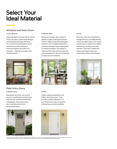 2 | p e l l a . c o m 3CLAD-WOODEnjoy the beauty and warmth of natural wood, our most customizable designs and exceptional energy efficiency. Our innovative EnduraGuard® wood protection provides advanced protection against the effects of moisture — helping to provide years of performance.* Pella’s proprietary fiberglass material has displayed superior strength over wood, vinyl, aluminum, wood/plastic composites, and other fiberglass materials used by leading national brands in tensile and 3-point bend tests performed in accordance with ASTM D638 and D790 testing standards.1 Study of homeowner perceptions of leading national brands. Study commissioned by Pella, 2021.2 See written limited warranties for complete details, including exceptions and limitations, at pella.com/warranty, or contact Pella Customer Service.Why You Can Trust PellaSelect Your Ideal MaterialRATED #1 BY HOMEOWNERSFOR INNOVATION 1Our drive to improve what we do and how we do it has earned us more than 150 patents on groundbreaking innovations. Like the patent-pending Integrated Rolscreen® retractable screen that appears automatically when you open the sash of your single- or double-hung window. And the revolutionary, patent,pending Easy-Slide Operator hardware for casement and awning windows allows you to simply slide to open, without the effort of cranking.R A T E D # 1 B Y H O M E O W N E R S FOR HIGHEST QUALITY 1We sweat the details so you don’t have to, delivering products created specifically for you. We tried to count the number of quality checks that we do in a typical hour, but we had to stop at 7,502 to get back to work. At Pella, just meeting requirements isn’t enough. That’s why we test beyond industry standards to ensure quality windows and doors that are built to last.Windows and Patio DoorsPella® Entry DoorsF I B E R G L A S S Windows and patio doors ready to handle virtually anything life throws at them. Pella's proprietary fiberglass material is the strongest material for windows and patio doors, engineered for lasting durability.* It’s tested to withstand the most extreme heat and cold, damaging UV rays and conditions of seacoast environments. F I B E R G L A S S Appreciate the warm, rich look of wood or a prefinished smooth panel with the low-maintenance benefits of fiberglass. These doors have dent-resistant panels and a rot-resistant frame.V I N Y L When you want low maintenance, energy efficiency and affordability, vinyl is the right choice. Our unique vinyl formula is tested for excellent weathering, durability and color retention. And multi-chambered frames and metal-reinforced interlocking sashes add strength.STEELCreate a lasting impression with Pella’s steel entry doors. They provide a quality appearance to your home that’s easy to maintain, while giving you extra durability. B A C K E D B Y O N E O F T H E S T R O N G E S T LIMITED LIFETIME WARRANTIESYou can feel confident in your investment. We pride ourselves on providing exceptional quality, exceeding expectations and going beyond requirements. That’s why we stand behind our windows and patio doors with a limited lifetime warranty.2M O S T P R E F E R R E D W I N D O W A N D D O O R BRAND BY HOMEOWNERS 1At Pella, we make beautifully designed products that you can be proud to own— but you don't have to take our word for it. Pella is the most preferred window and door brand by homeowners.1Pella Reserve — ContemporaryPicture, special shape and casement windows with a Black exterior.