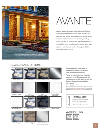 MODERNdesign,natural LIGHTFRAME/SOLID PANELCOLOR OPTIONSDue to the anodizing process,color variation may occur.The use of “Bronze (Painted)”is recommended for a moreconsistent bronze finish color.Clear Aluminum(Anodized)Standard White(Painted)Bronze (Painted)Dark Bronze (Anodized)Bronze (Anodized)Black (Anodized)Chocolate(Painted)Model AXU not available with RAL Powder Coat finish.CUSTOM PAINT OPTIONSCustom colors make Avante® garage doors personal. Choose a Color Blast®finish or RAL Powder Coating to create the perfect door. The only limit is yourimagination! See your Clopay Dealer for details.STYLE AND CONSTRUCTION■ Aluminum frame provides a virtually maintenance-free, long-lasting door.■ Intellicore® polyurethane insulated rails and stiles.(Model AXU)■ R-value 3.8/U-factor 0.86.(Model AXU when glazed with clear insulated glass)■ Many glass and panel options available.■ Section joint seal helps keep out air and water.■ Heavy-duty steel ball bearing rollers with nylon tires provide quiet operation.See your Clopay Dealer for WINDCODE ® availability.Calculated door section R-value is in accordance with DASMA TDS-163.Model AXU Model AXAvante® Bronze (Anodized) Frame with Frosted Tempered Glass; Smooth Fiberglass Collection Entry Door with Clarion™ Frost Glass in Custom Complementing Finish9Avante® garage doors are designed with architects, contractors and homeowners in mind. With a sleek aesthetic and section seal, these doors are the perfect choice to modernize any home. Not only can they transform garages, they can also be used as an indoor loft partition or as versatile solarium doors. Many glass options are available to control the degree of light transmission and privacy.AVANTE®GLASS/PANEL OPTIONSWARRANTIESWARRANTY3 YRLIMITEDHARDWAREWARRANTY5YRLIMITEDFINISH■ Glass available in single pane orinsulated (laminated and mirroredglass not available insulated).■ Panels can be aluminum to match thealuminum frame. Glass/acrylic panelsmay be combined with aluminum panels.Custom glass and colors available.*Glass is tempered.See your Clopay Dealer for details. Acrylic windows require special cleaning. Never use products that contain ammonia or petroleum products to clean acrylic. Please visit www.clopaydoor.com/acrylic for complete details.Clear Glass*WhiteLaminate GlassBlackLaminate GlassFrosted Acrylic Clear Acrylic Gray Acrylic White Acrylic Frosted Glass*(Satin Etched)Gray Tinted Glass* Bronze Tinted Glass* Mirrored Glass*Obscure Glass*Clear Polygal™ Bronze Polygal™ Clear Anodized(Color-matched to frame)HARDWAREAttractive color-matched aluminum grip handles.Available in all standard color options.