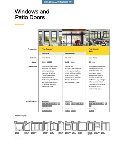 4 | p e l l a . c o m 5For more information on Pella’s window and patio door offering, see your local Pella sales representative or visit pella.com.Windows and Patio Doors Pella® windows and doors offer energy-efficient options that will meet or exceed ENERGY STAR®guidelines in all 50 states.11 Some Pella products may not meet ENERGY STAR® guidelines in Canada. For more information, contact your local Pella sales representative or go to energystar.gc.ca.2 Additional special shapes also available.3 Performance solutions require upgrades to triplepane, AdvancedComfort Low-E and mixed glass thickness. Based on comparing product quotes and published STC/OITC and U-Factor ratings of leading national wood window and patio door brands.4 Double-hung window only available with dual-pane glass. 5 Pella’s proprietary fiberglass material has displayed superior strength over wood, vinyl, aluminum, wood/plastic composites, and other fiberglass materials used by leading national brands in tensile and 3-point bend tests performed in accordance with ASTM D638 and D790 testing standards.6 Double-hung window available in East Region only.7 Product availability varies by location. Please contact your local Pella rep for details. AwningWindowWindow Styles2Patio Door StylesAngle-TopWindowBay or BowWindow SlidingPatio DoorSDHingedPatio DoorHDBifoldPatio DoorBFMulti-SlidePatio DoorMSPush-OutCasementWindowFixedWindowPictureWindowSingle-HungWindowDouble-HungWindowSlidingWindowPatio Door StylesSDWindow StylesAP SHATSWB C DH FPellaImpervia®Pella Impervia products are engineered to last. Our proprietary fiberglass material provides unmatched strength and lasting durability with sleek, timeless style.5 Tested in extremes and designed for every day, these windows and patio doors deliver proven performance.$ – $$FiberglassPella250 SeriesPella 250 Series products offer innovative and enhanced security and privacy features for more peace of mind. Made with beautiful easy-care vinyl, these windows and patio doors provide Pella craftsmanship in a great-looking product.$VinylPatio Door StylesSDWindow StylesAP SHATSWB C DH FEncompass by Pella7Encompass by Pella is competitively priced, easy-care vinyl. Featuring low-maintenance, highgrade vinyl frames, these windows and patio doors will look great for years and are backed by a brand you can trust.$ – $VinylPatio Door StylesSDWindow StylesAT B DH6 P SH SWPatio Door StylesHD SDWindow StylesA B C DH4 FPPella Lifestyle SeriesPurposeful innovations delivering room-byroom solutions like integrated blinds, shades and security sensors. Available performance packages offer an unbeatable combination of energy efficiency, sound control and value.3$ – $$Clad-WoodPella® Reserve™Exquisitely designed windows and doors with unparalleled historical detailing. Featuring throughstile construction, deliberate proportions and intricate profiles to achieve authentic traditional style.$$ – $$$Clad-WoodSimple and sophisticated designs with expansive glass, sleek, minimal profiles and through-stile construction embody the tenets of pure contemporary style.$$ – $$$Clad-WoodTraditional ContemporaryPatio Door StylesHD SD BF MSWindow StylesA AT C CO F P PC ATProduct LineDescriptionPriceMaterialAvailable StylesPatio Door StylesHD SD BF MSWindow StylesAF PATPCB C CO CT DH CT CT CTSHCurve-TopWindowA AT B CT PCCasementWindowCCornerWindowCO DH F P SH SWEXPLORE ALL WINDOWS >>>